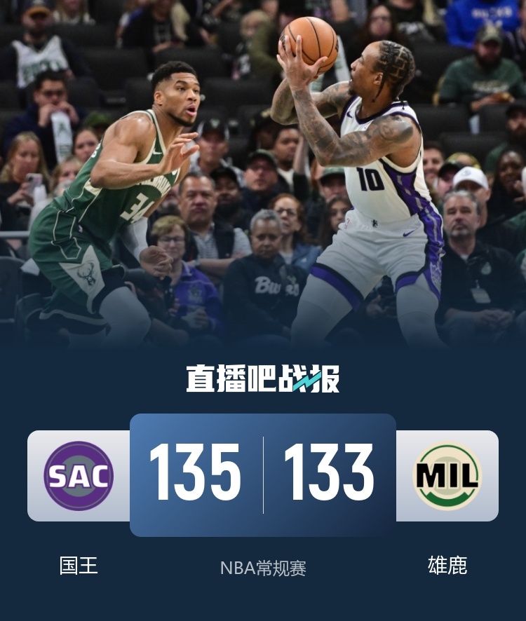 比赛开始,雄鹿上来外线多点开花,连中5记三分打出21-5开局,国王则是攻击内线追分,双方对攻,首节雄鹿8记三分轰出47分领先11分,次节国王上来7-2追分,但雄鹿替补能回应,随后拉文、德罗赞、小萨有内有外轮番打成一度追平比分。下半场,拉文和施罗德连续扔进三分反超比分,随后雄鹿断电4分钟内仅得4分,国王轰出17-4攻击波一举建立双位数领先,末节科尔-安东尼再累积一T被罚出场,库兹马连拿11分撑起进攻,但小萨连续杀伤回应,字母哥连罚加三分砍下8分重新咬住比分,特纳关键三分追到差1分,字母哥失误后施罗德两罚领先3分,AJ-格林三分不中,字母哥前场篮板补篮被帽,最终国王135-133险胜雄鹿。