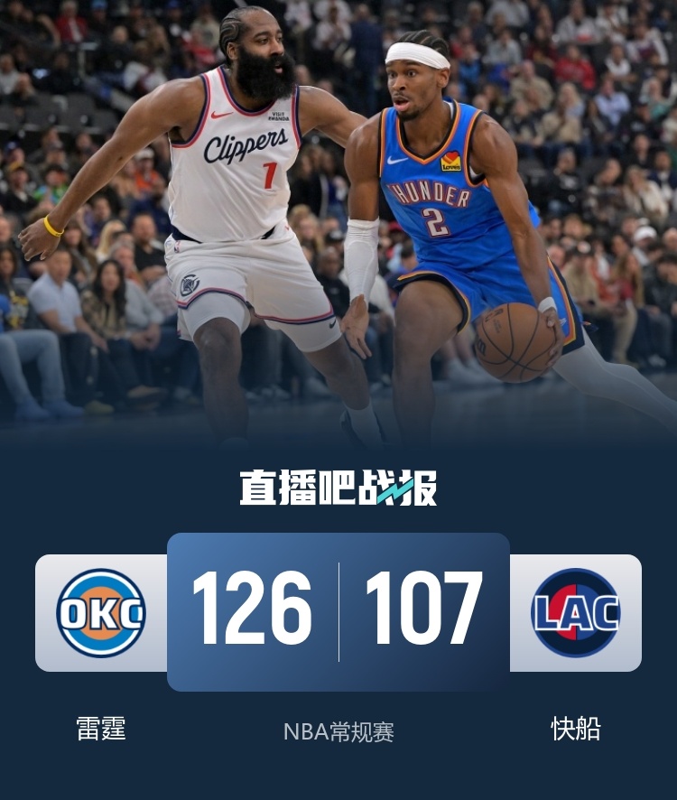 雷霆17-0打崩快船开季8-0 鸭梨30+12 哈登25+6+6 小卡缺战